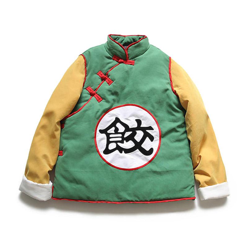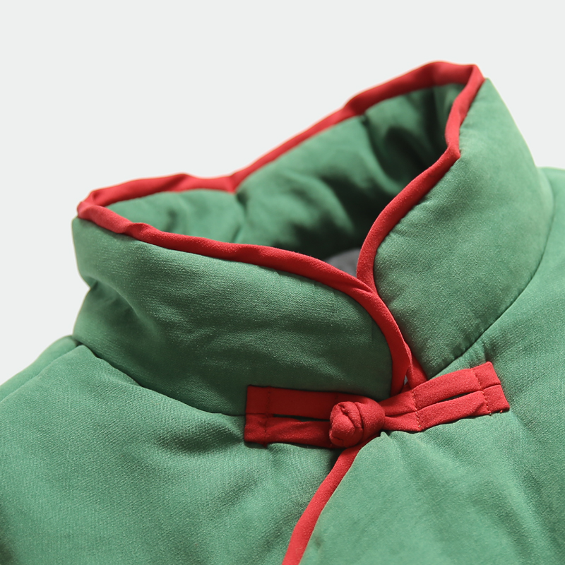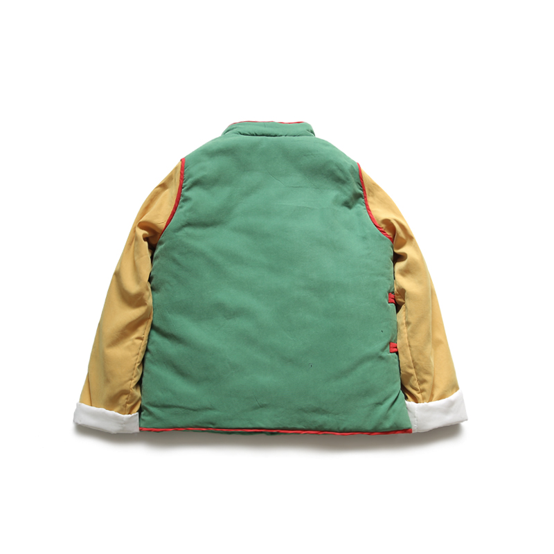 此款棉服设计灵感源自《七龙珠》中饺子的服饰,复古经典充满童真。以黄绿拼色设计,上身倍感年轻活力。前幅斜开襟设计,结合红色盘扣加持,营造出古典的中式风味。以撞色文字贴布装饰,结合精致的刺绣封边,视觉效果趣味吸睛。