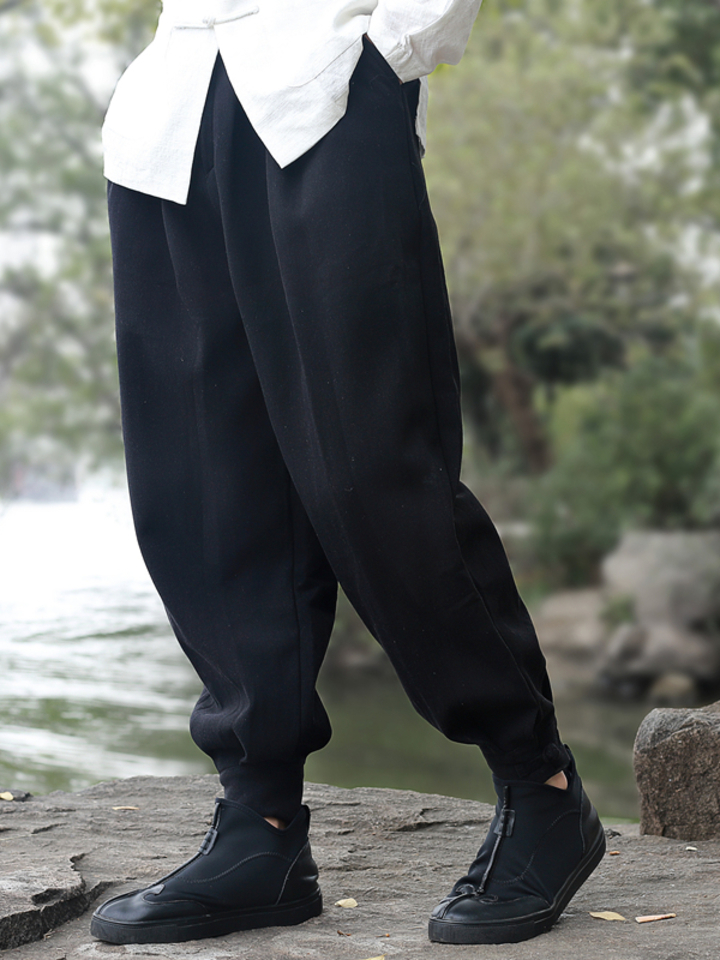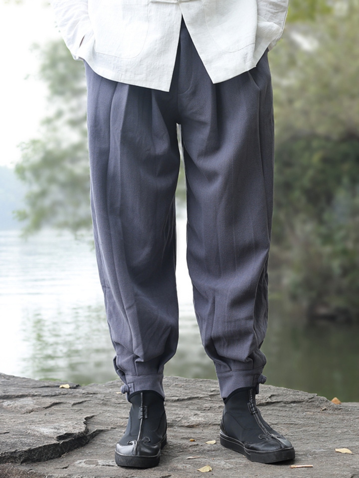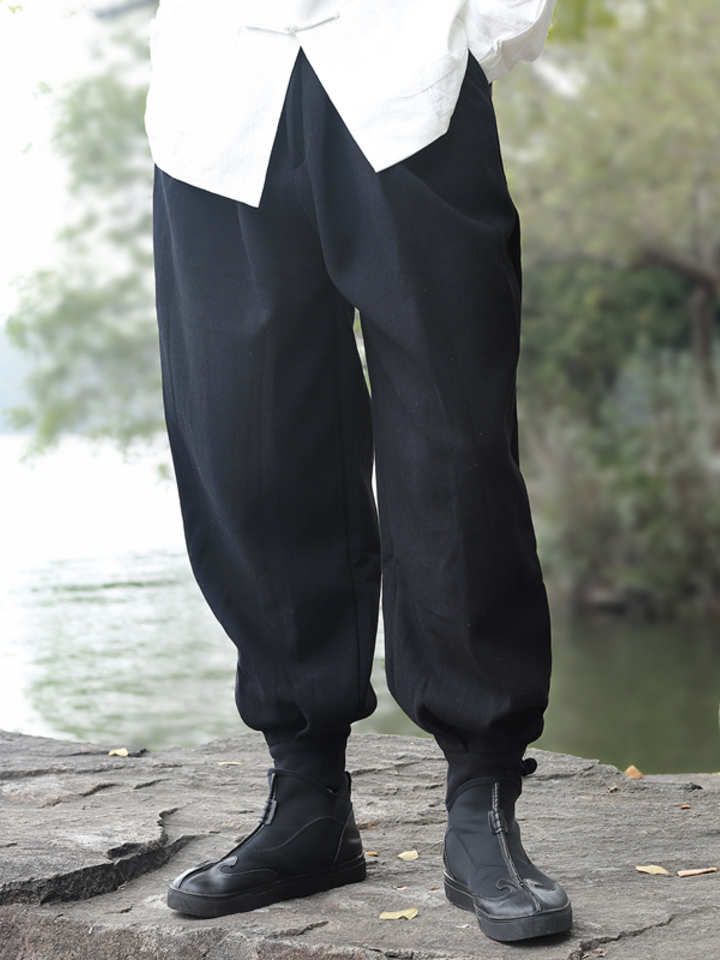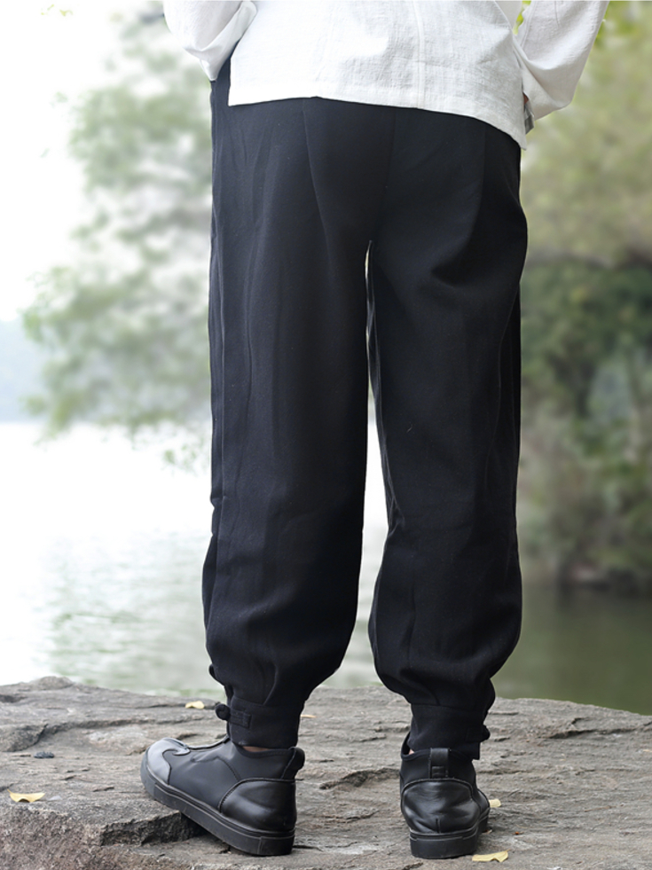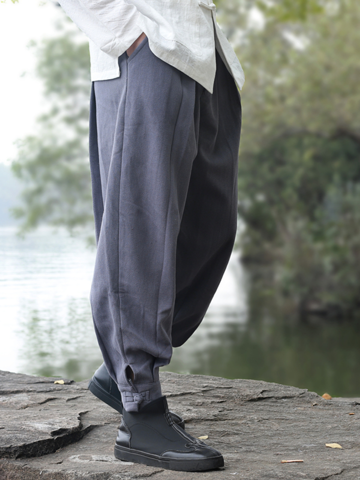 亚麻棉纯天然纤维织造,舒适,吸汗!简洁的造型,气场超强!此款为裤口褶边设计,小脚灯笼裤裤型,掉裆宽松。