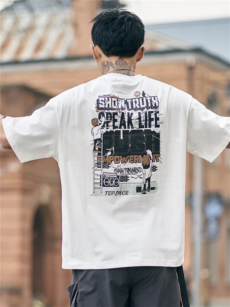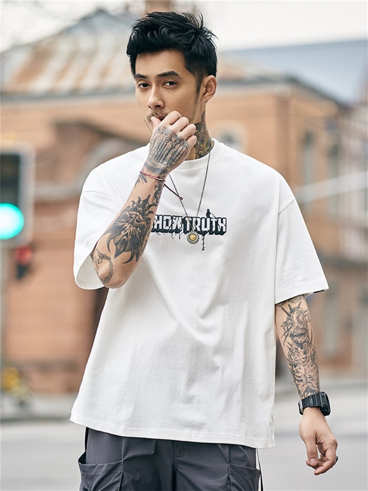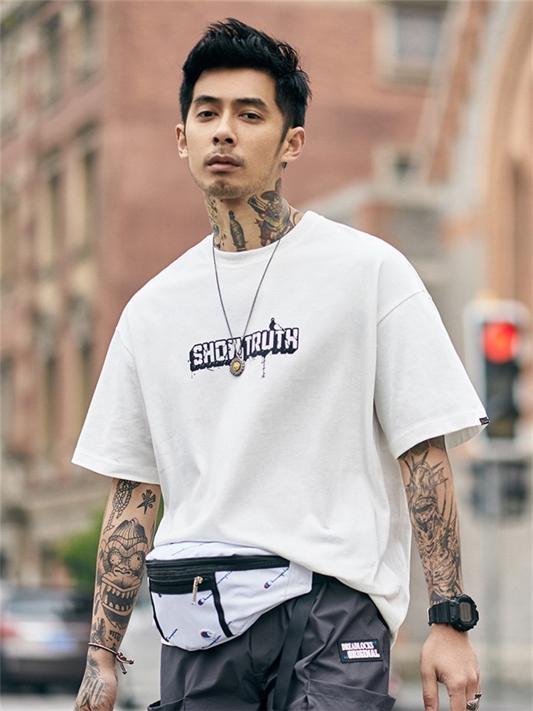 胸前字母印花,个性时尚,宽松T恤,让你轻松驾驭,字母印花,彰显时尚个性,胸前字母印花,个性潮流,短袖设计,修饰手臂线条,宽松的版型,嘻哈范十足。
