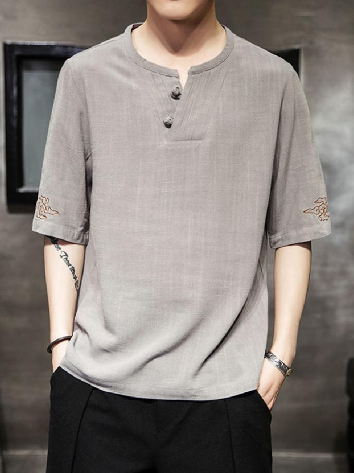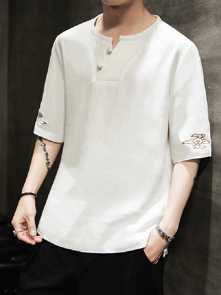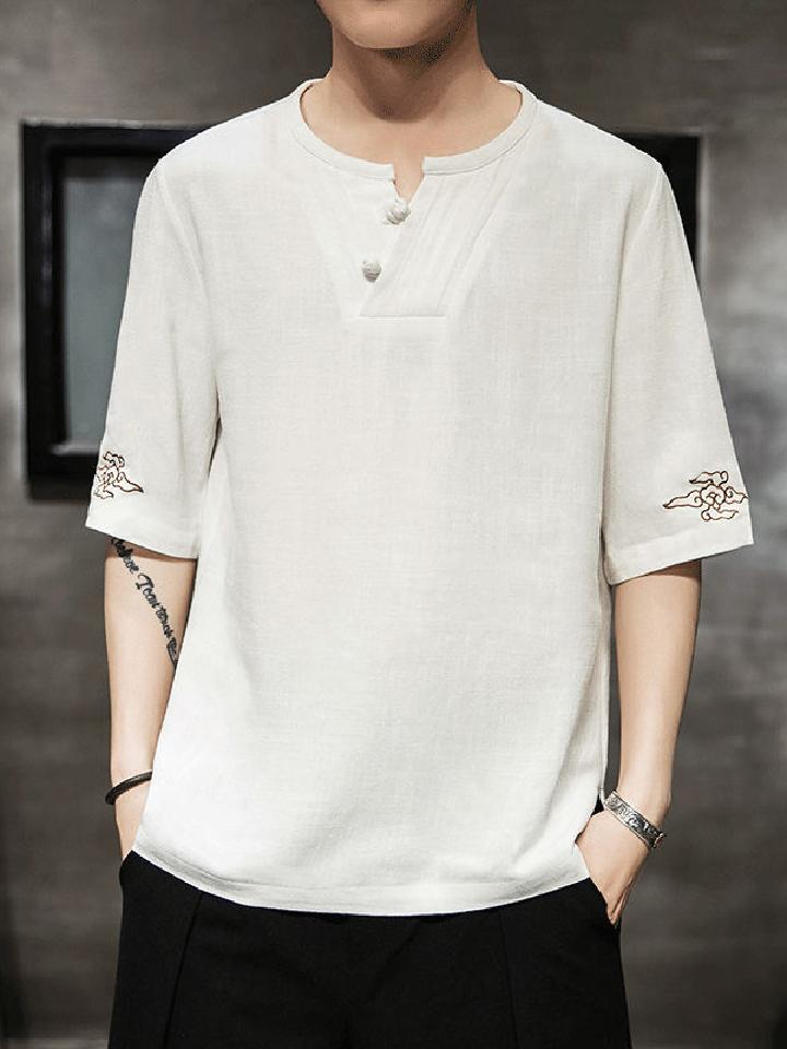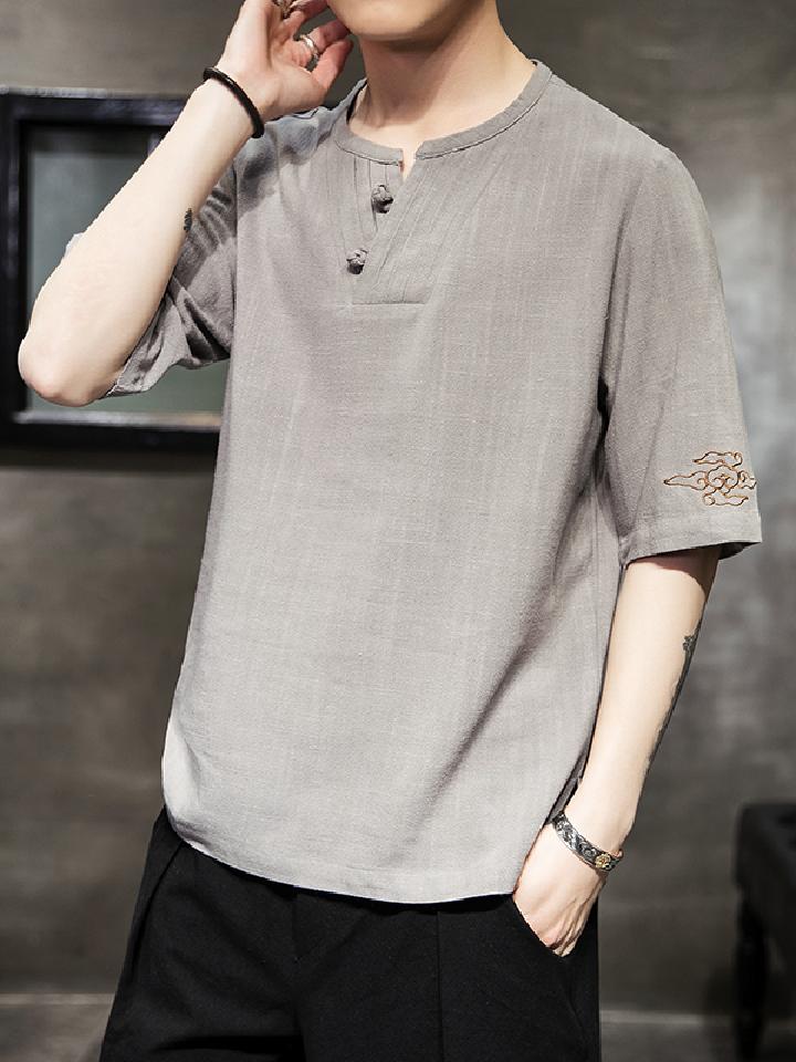 素净自然的布料,质朴的选色,散发着浓浓的中国风味。棉麻面料舒爽透气,吸汗快干。胸前门襟散发着新中式的风格,五分中袖更显复古。