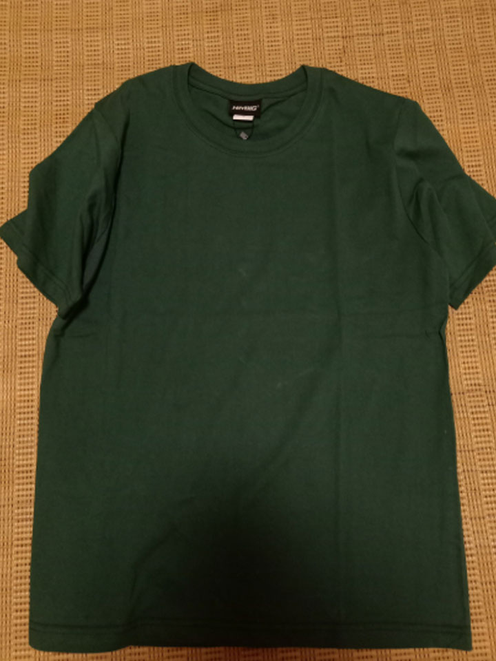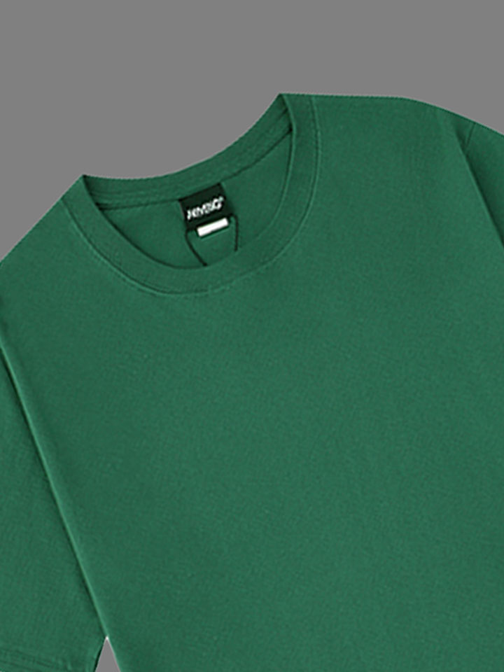 这款短袖体恤衫纯色青春流行风格,墨绿色清爽亮丽。标准版型设计,常规袖口穿着舒适轻盈,领口logo标志展示品牌形象。