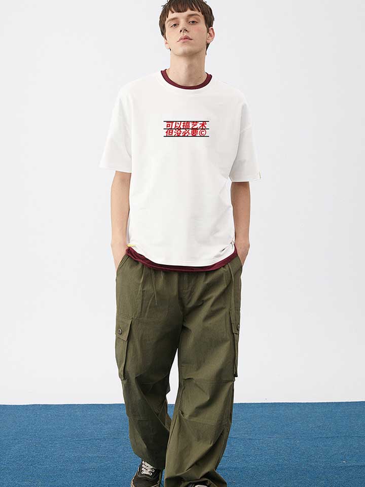 白色和红色的撞色设计还不够醒目,不如搭配一件军绿的工装裤,整体休闲又时髦。
