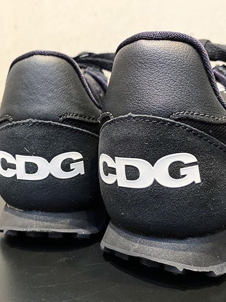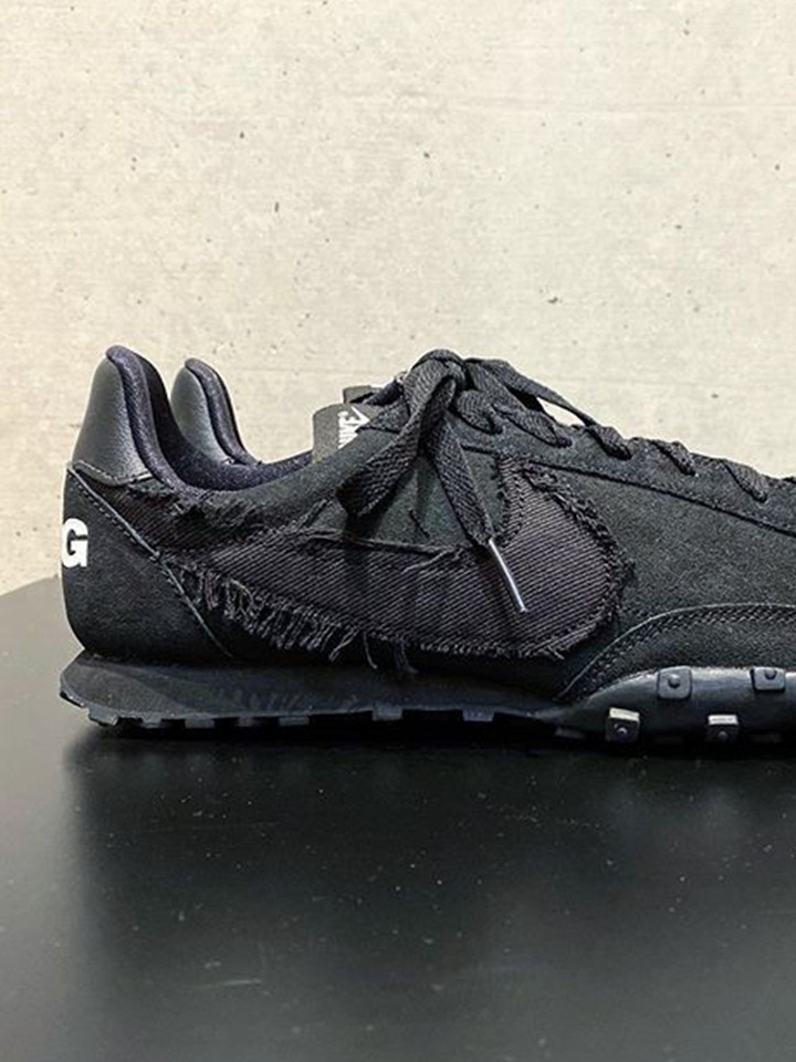 侧身钩子以破坏风格呈现,裸露的线头层叠,后跟点缀白色CDG Logo。