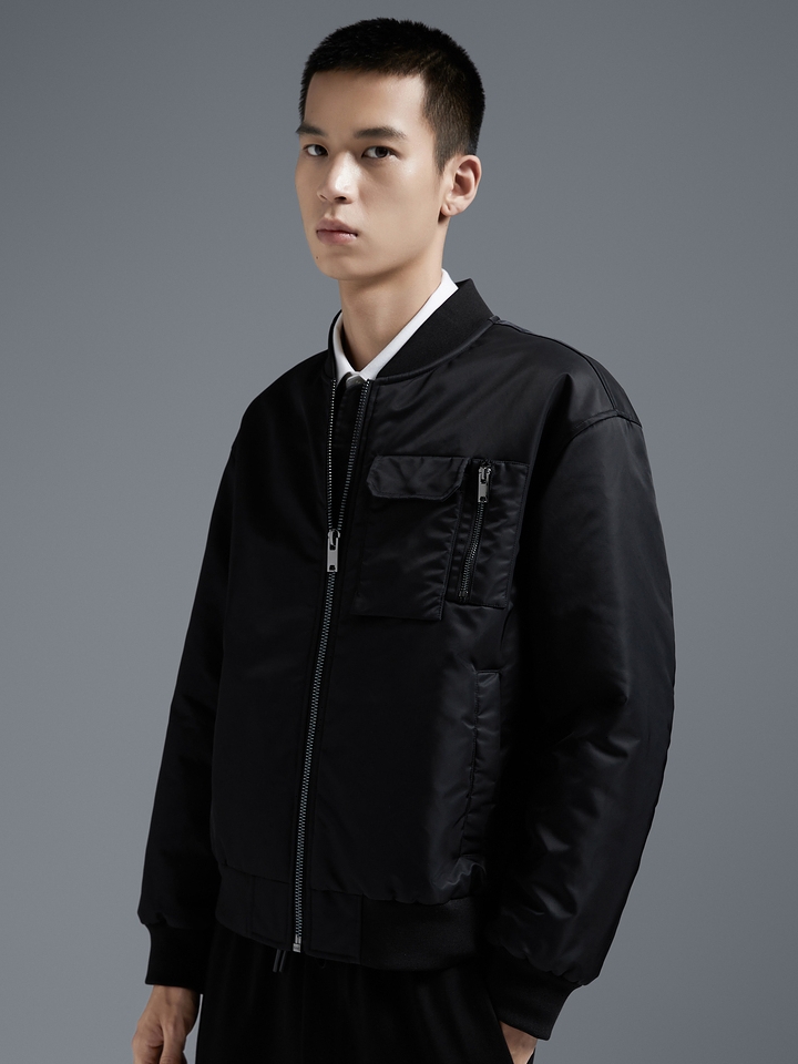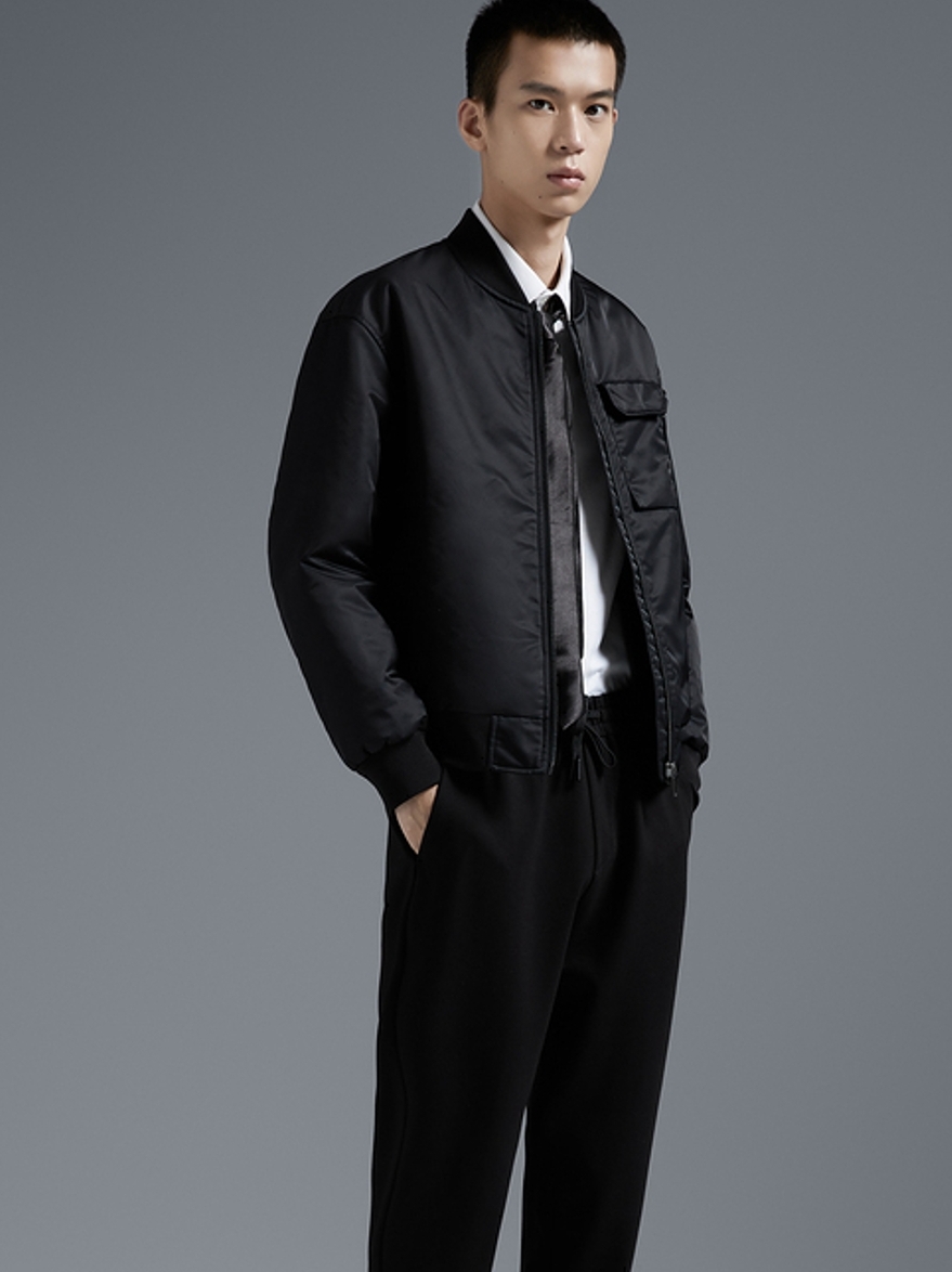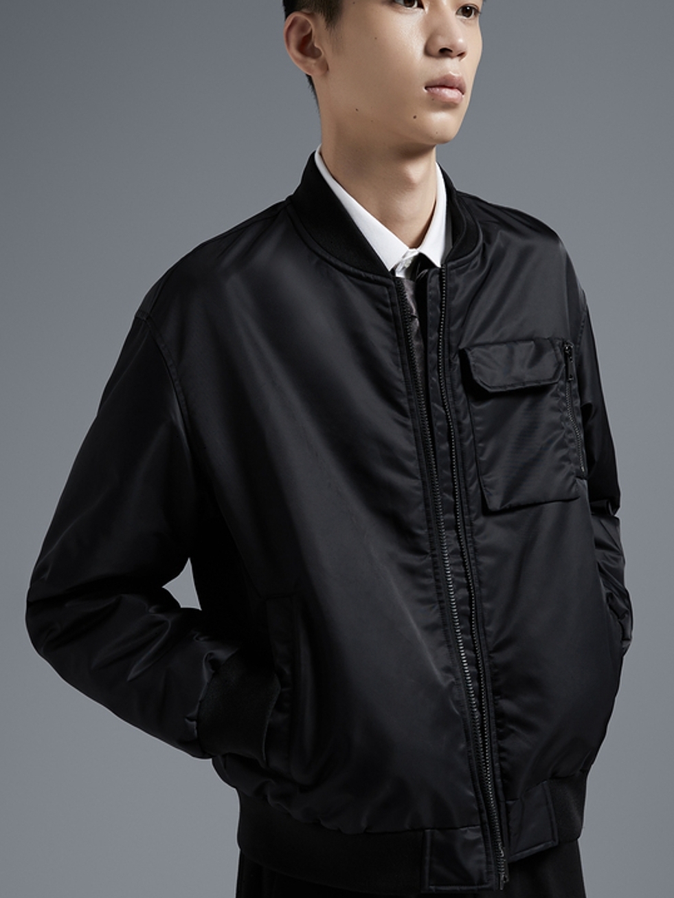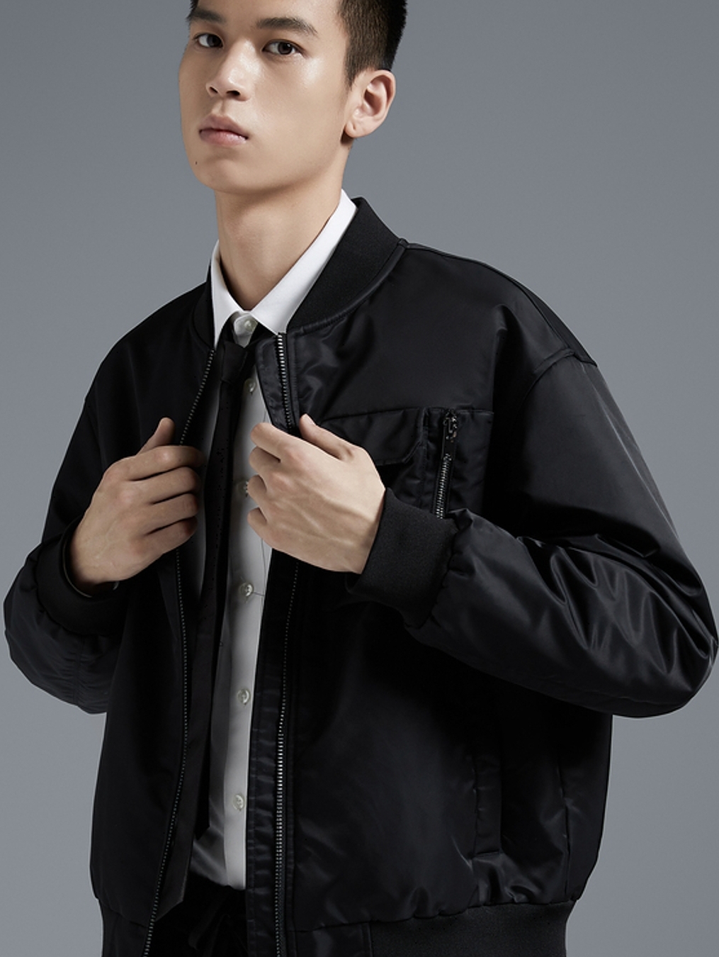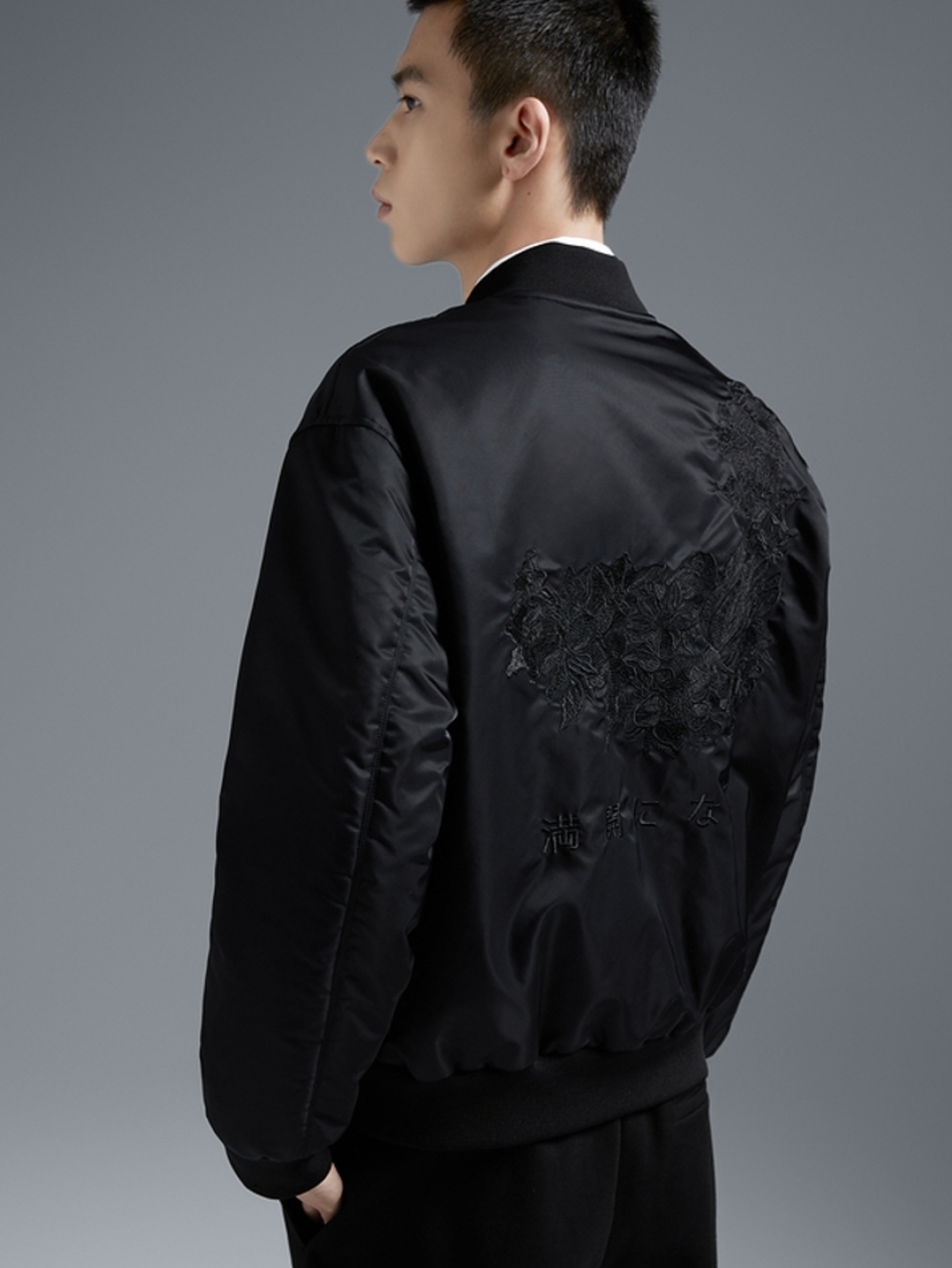 韩范儿十足的一款棒球夹克,正面采用了聚酯纤维,形成了网状效果与织带设计,质感十足,背后处独特的印花设计,增加了层次感与视觉冲击,标准的棒球夹克设计,上身清爽干练。