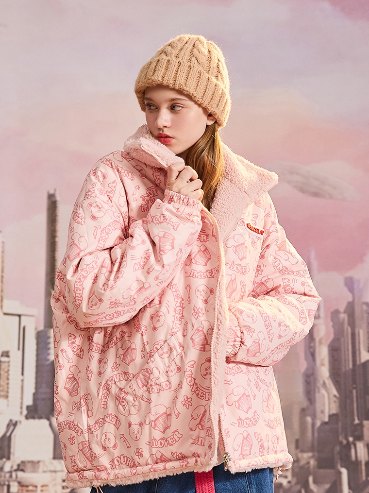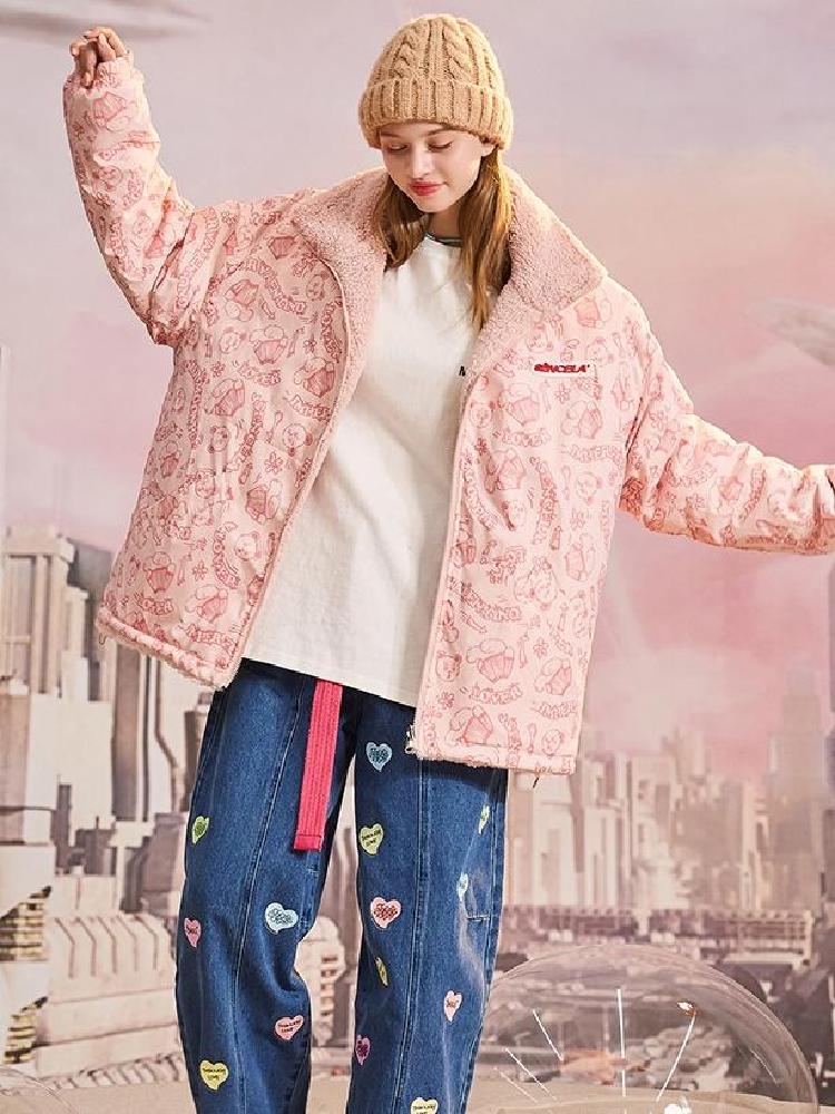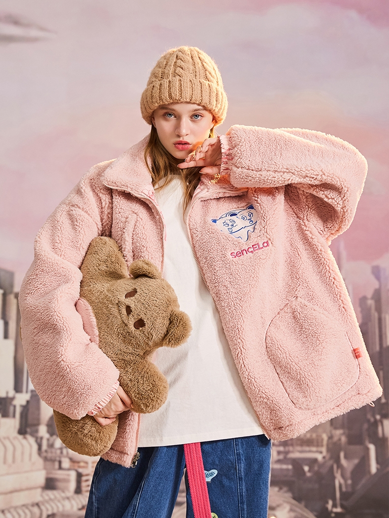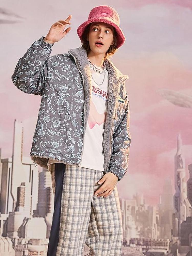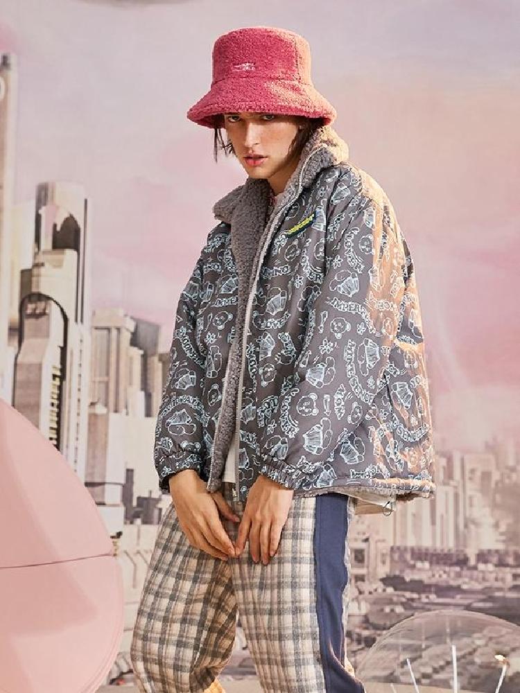 上身帅气十足的羊羔绒外套,时尚的印花是一大亮点,让你出街赚足回头率,羊羔毛的内里让你温暖一整个冬天