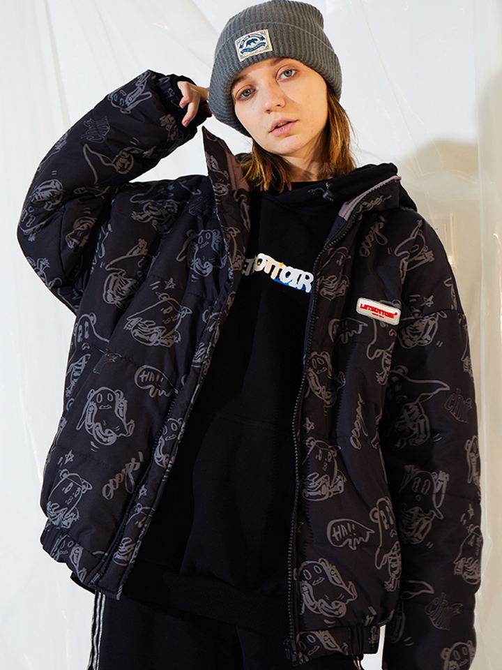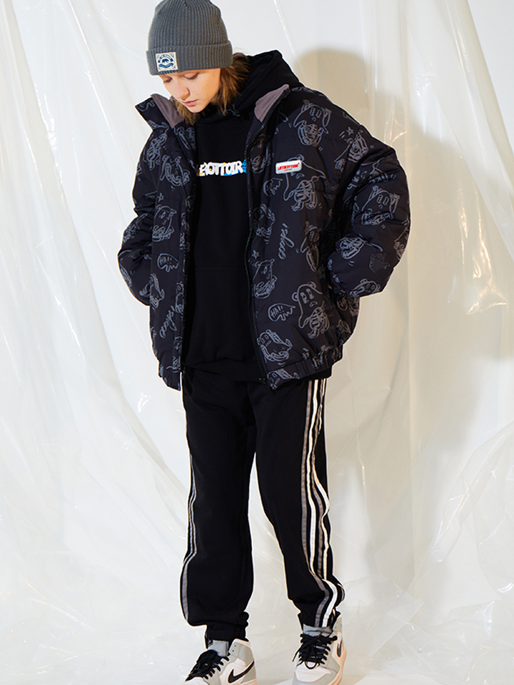 白色幽灵熊点缀在黑色衣身上,营造出与众不同的休闲风格。