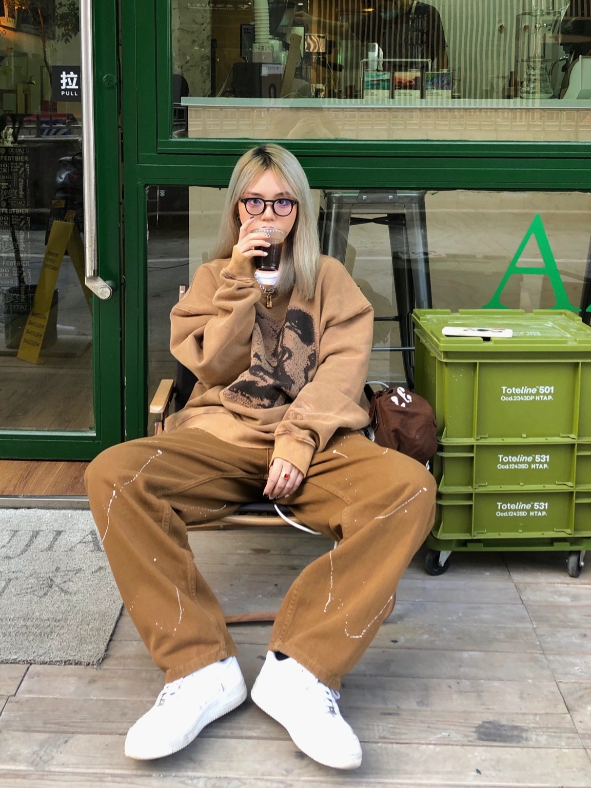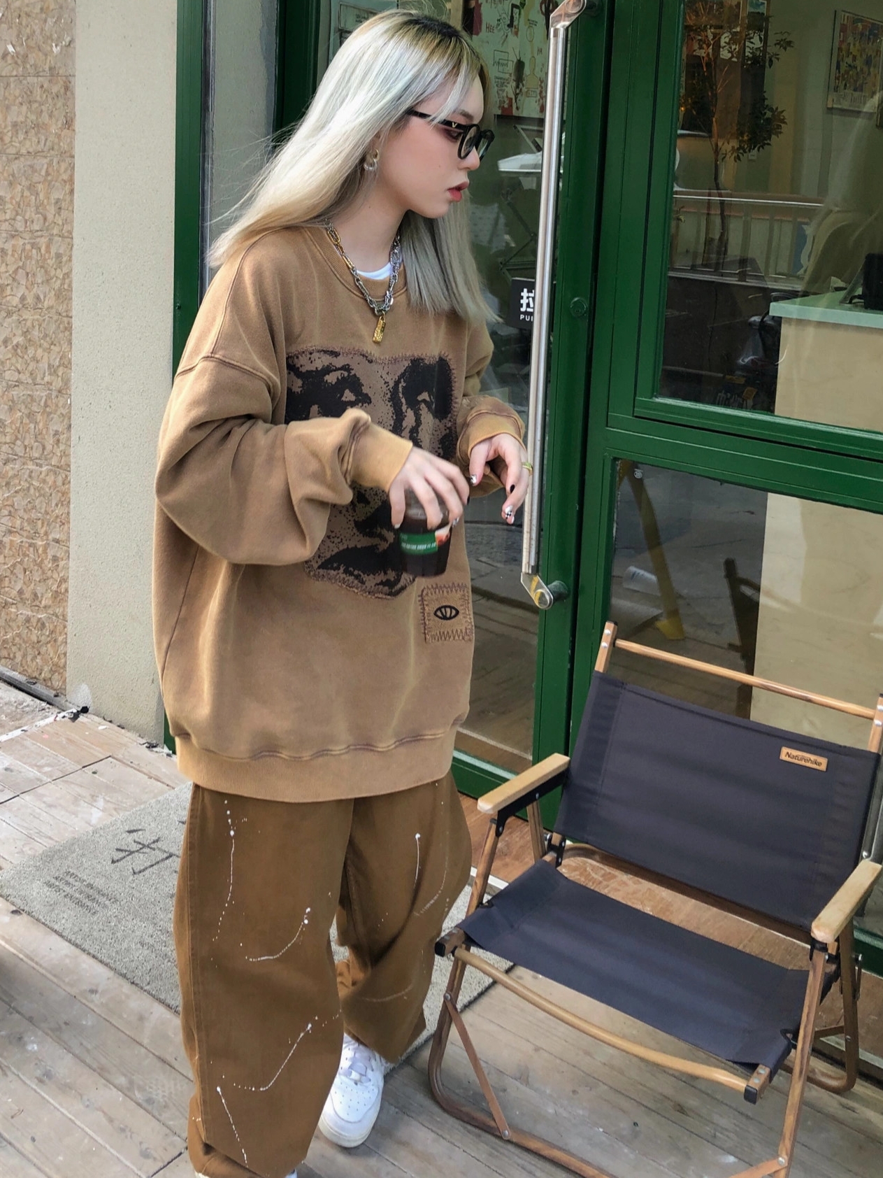这件卫衣真的很难不爱,落肩的设计和宽松的版型使得他对身材的包容度很高,对肩宽的姐妹们很友好,而且衣服的图案也很特别,很吸睛,有一种随意休闲的感觉,很适合日常通勤穿。