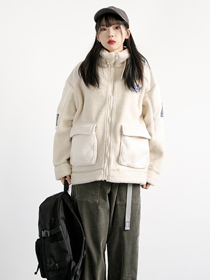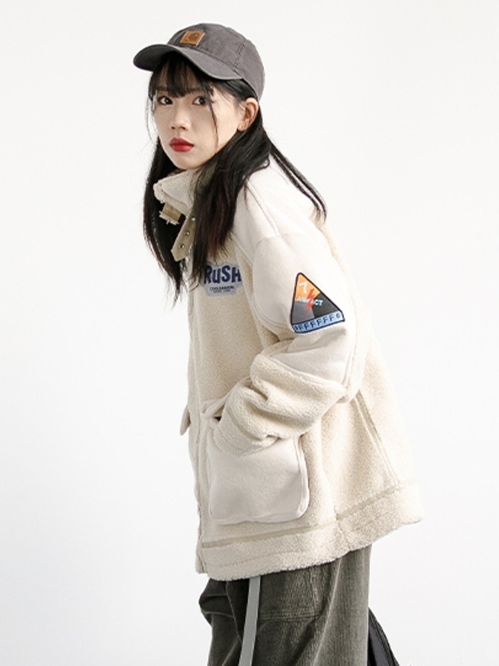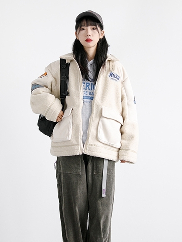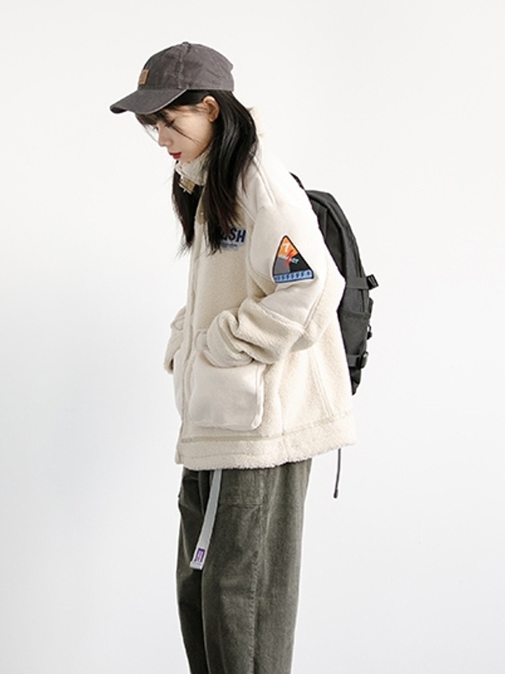 清新撞色的元素令人眼前一亮,绒感面料,精致度强,提升了整体的品质感。领部采用羊羔毛装饰,毛茸茸的环绕在脖子四周。