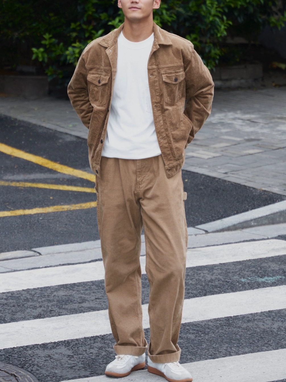 以灯芯绒面料设计,丰富视觉层次感,更显时尚复古;翻领设计,巧妙添注不羁潮帅型男魅力;两个口袋的装饰,富有立体感。