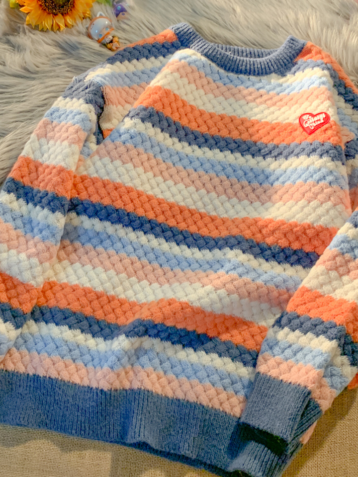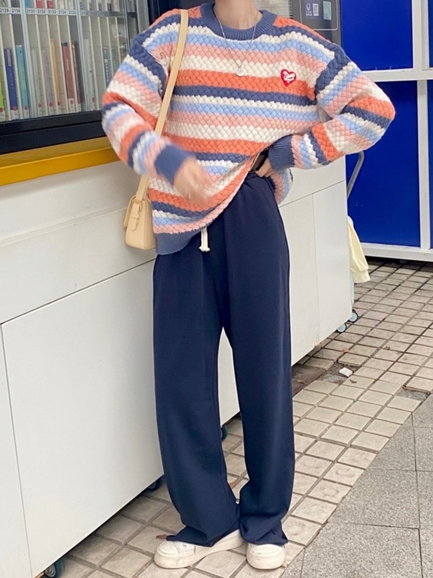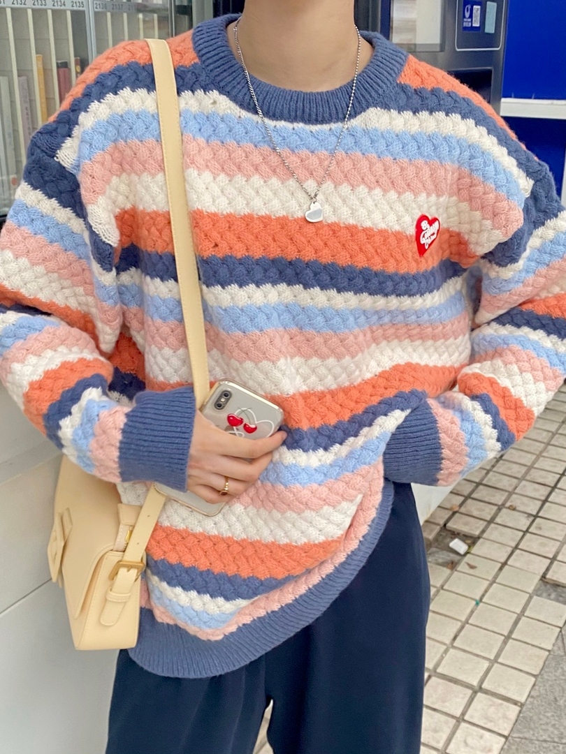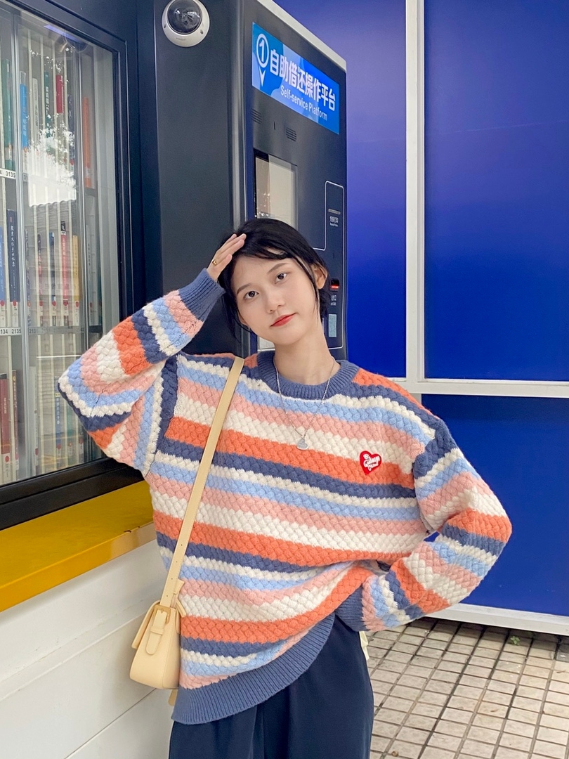初见这款彩色条纹毛衣的时候,我就爱上它了,经典的圆领造型,很好的修饰了我的脖颈线条,让穿脱变得很方便,带来了满满的休闲气息。