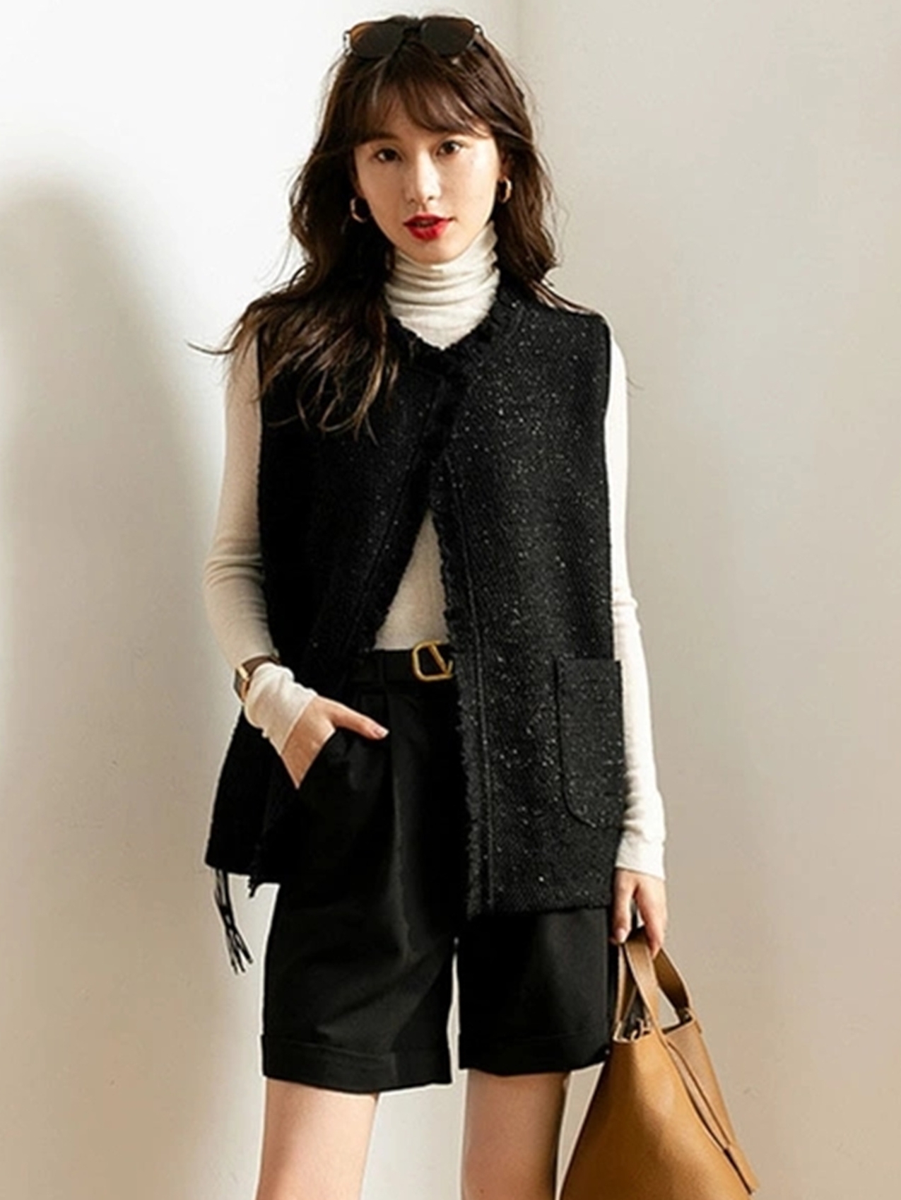 简约的高腰设计,搭配上修身的版型,上身显瘦又显高。