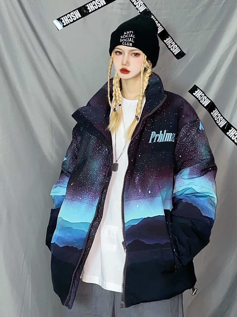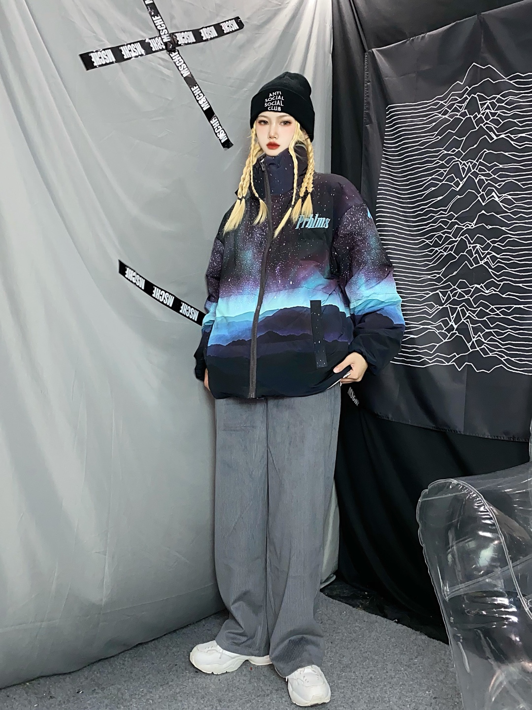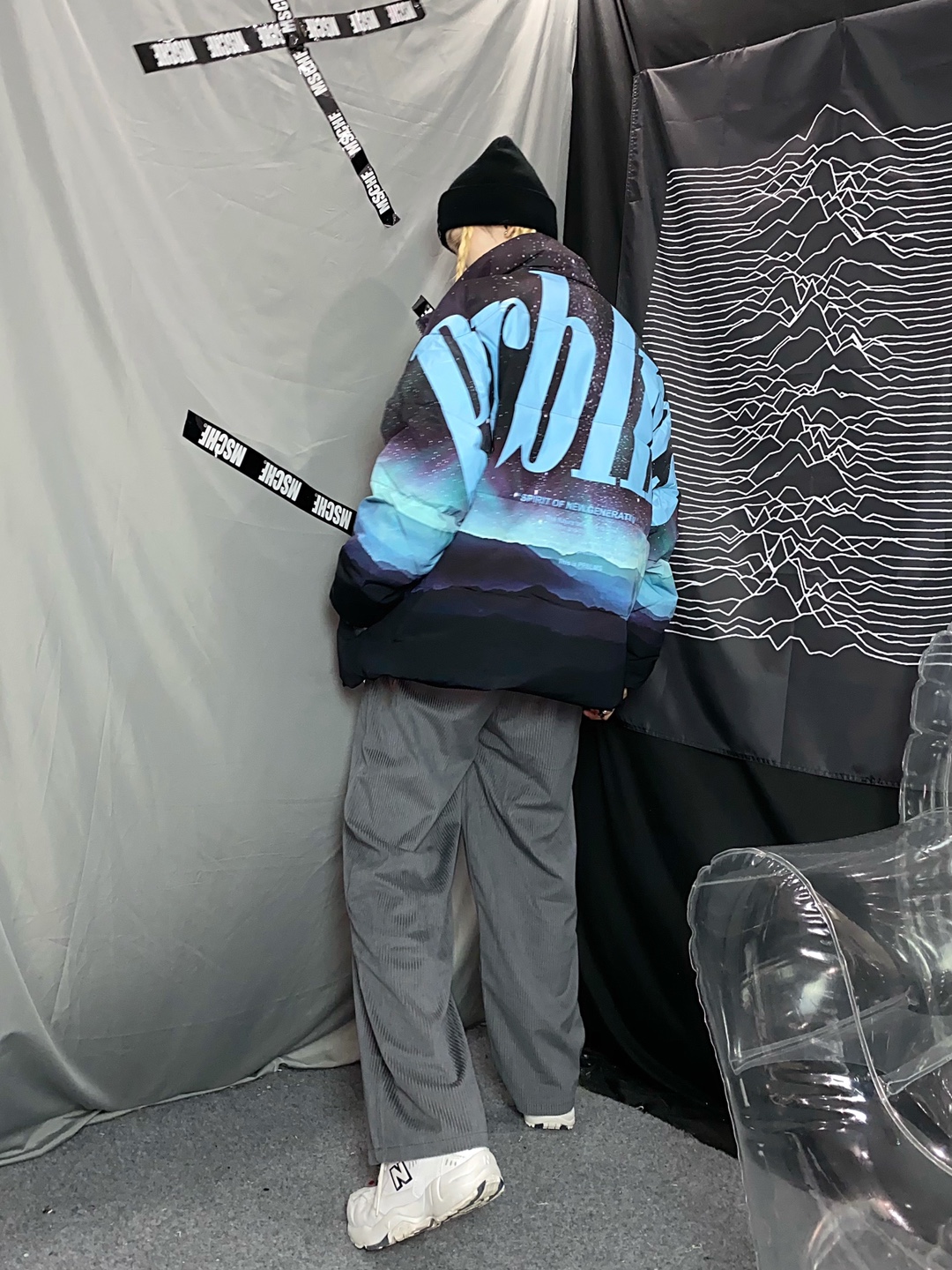 衣身的不规则条纹提升了整体的视觉效果,亮色辅助印花加强了设计感,前侧双口袋保证了日常功能性,面料带有防水效果,保暖又有型的一款