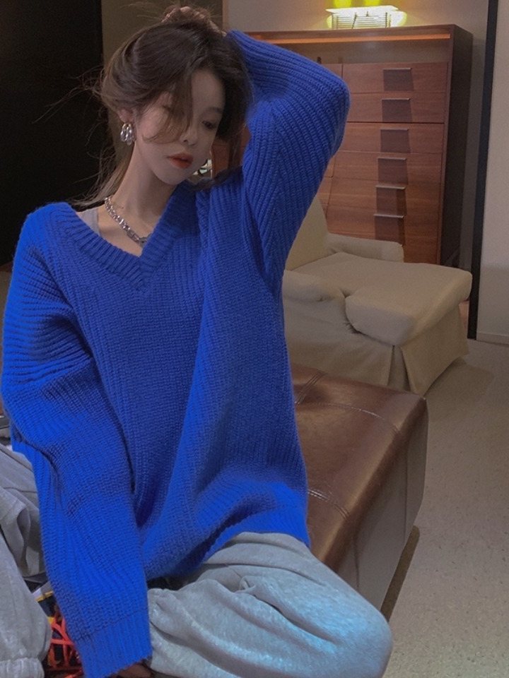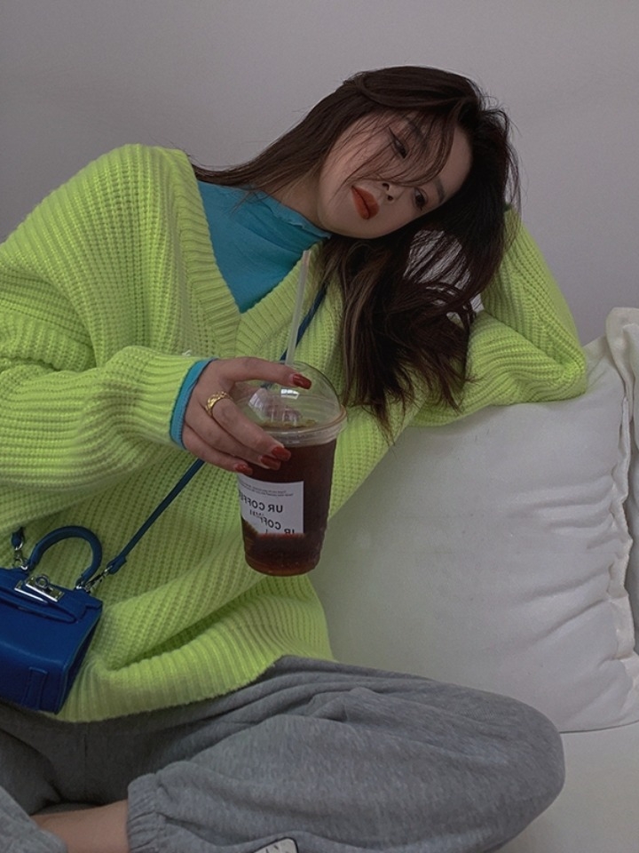 V领毛衣,慵懒宽松的版型,带点小性感。粗粗的纹理,质地较柔软,比较保暖。可内搭T恤或衬衫穿,营造层次感。