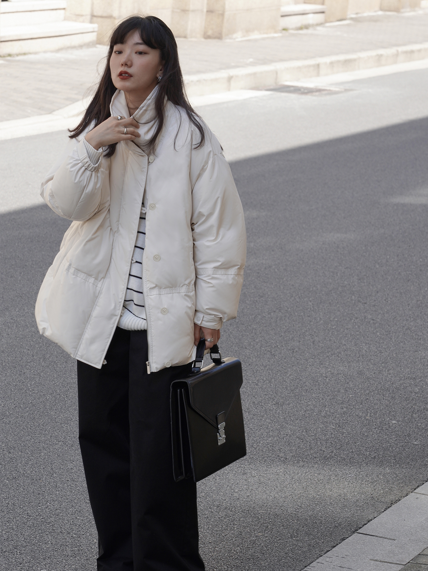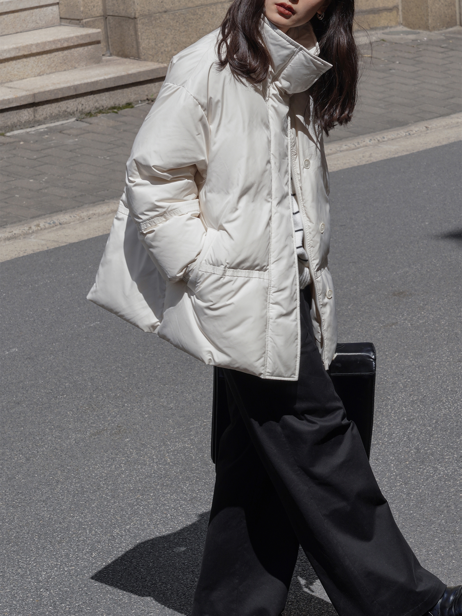 蓬松的质感会类似于刚出炉的面包,斜向插肩袖则平衡了堆积的膨胀感,上身效果会不臃肿。小个子也可以轻松驾驭。