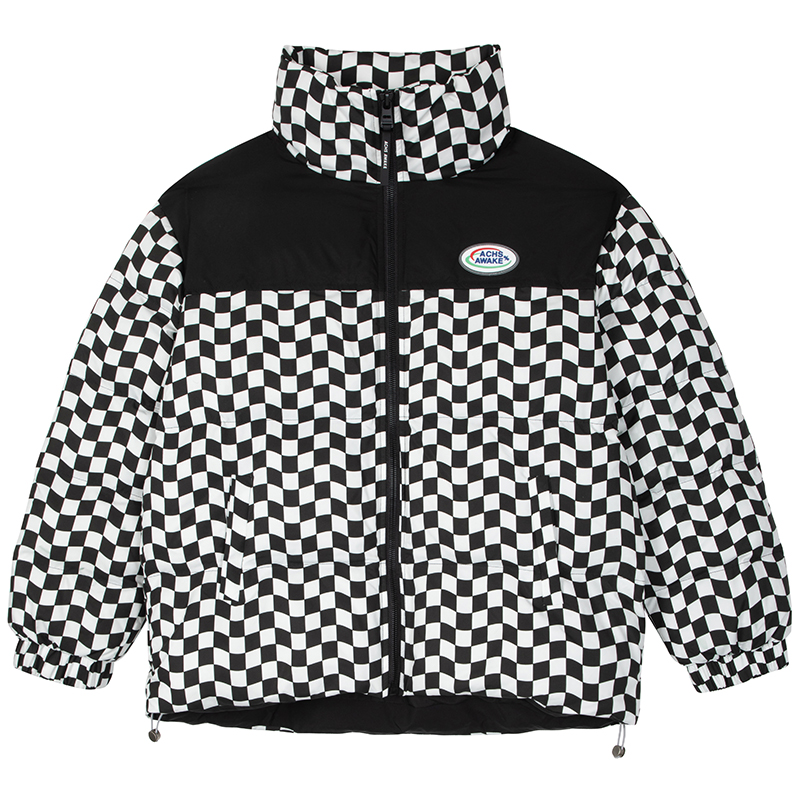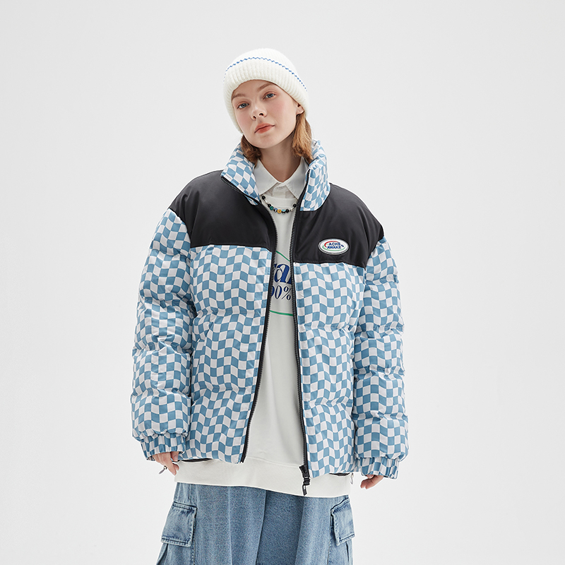 棉服设计,穿着舒适保暖,短款外套,拉长身材比例,撞色拼接设计,个性时尚。