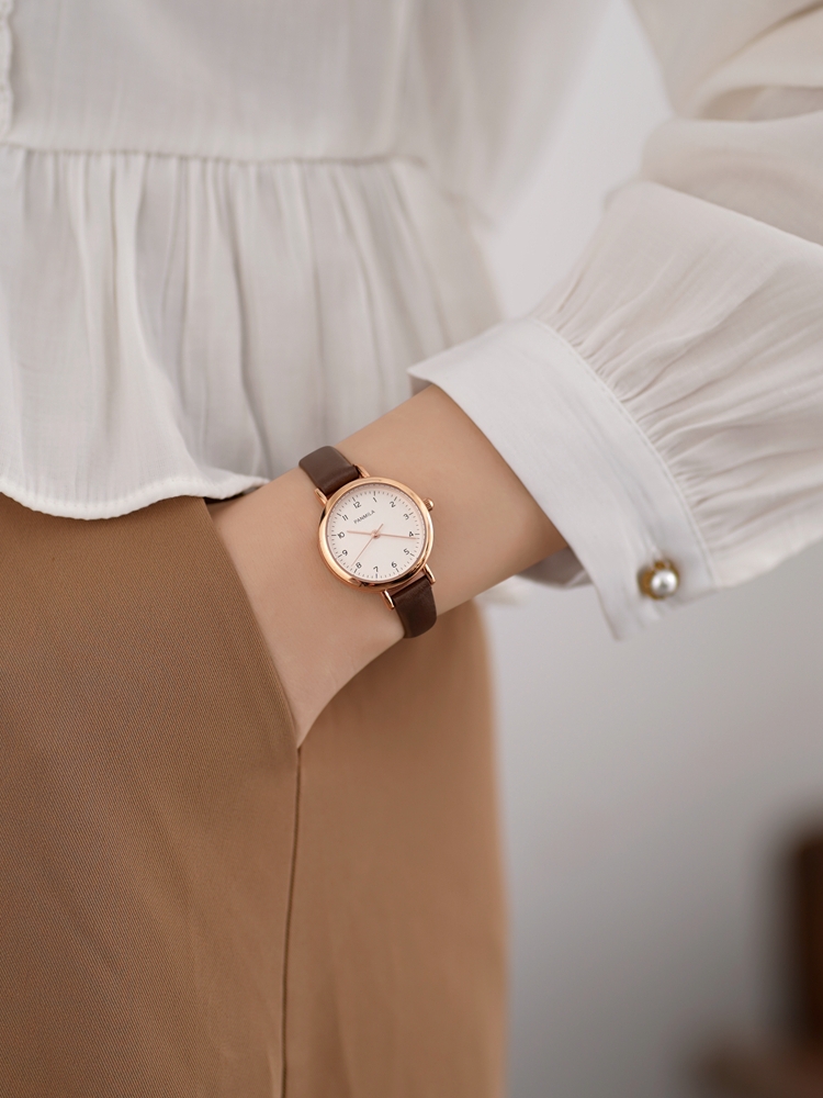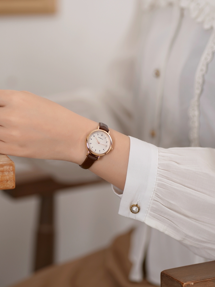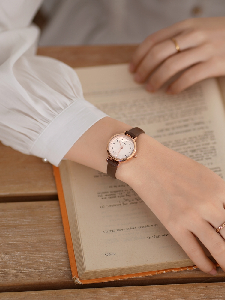 棕色的表带有一种,简约复古的风格,表盘小巧精致,非常适合女生佩戴,有一种优雅的感觉,带着很舒适,非常喜欢!